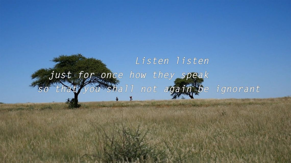 Since 2018, I have specifically focused on marginalised, endangered and extinct languages of the San and Khoekhoe people within the context of the Dutch colonisation of South Africa. I collaborated with storytellers, heritage activists and people that are involved in language revitalisation programmes. And I took language classes in Khoekhoegowab, inspired by the question ‘What if the Dutch colonists would have learned to speak San and Khoe languages instead of imposing their own languages upon those they encountered?’ and ‘What would I experience if I were to learn such a language now?’ This multilingual and collaborative endeavour resulted in several artworks that document and reimagine pivotal moments in Dutch and South African colonial history and introduce perspectives that intervene in dominant historical narratives. The films A Few Common Phrases, Sida Îtse, and Kulimatji (all 2018) that are part of the LI-MA collection, are examples of that. In these works, I also explored how accounting for my own position could become part of the content of an artwork, as I was both in front of the camera and behind it.