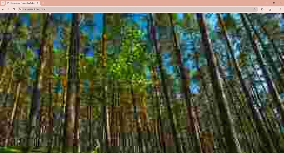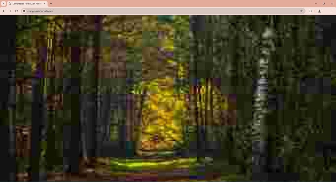 Voordat de bos-afbeeldingen in de browser zichtbaar zijn worden ze eerst gecomprimeerd. Comprimeren is het digitaal 'samendrukken' of 'inpakken' van bestanden. Door dit proces vertonen de afbeeldingen een vastgestelde pixelwaarde. De pixelwaarde is laag, waardoor de afbeeldingen niet helemaal scherp op de website worden getoond, een bewuste keuze van de kunstenaar.