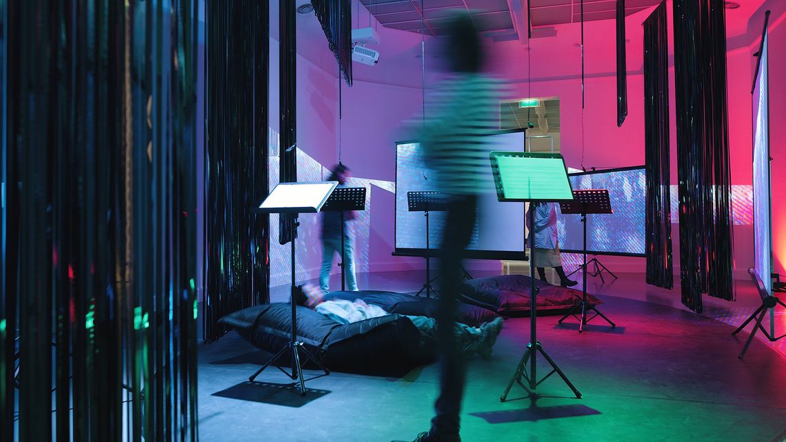 Voor REWIND / REPLAY digitaliseerde susan pui san lok / lok pui san niet-gecatalogiseerde tapes uit het Gate archief. Ze gebruikte delen daarvan voor de geluidsinstallatie in deze zaal, evenals opnames van acteurs die een script instuderen. Op de beeldschermen wordt o.a. werk van kunstenaar Ho Tam getoond. Beelden en licht uit verschillende bronnen vormen een vreemde, nieuwe mix. Uit hun cassette gehaalde magnetische tapes hangen verspreid in de ruimte. Muziekstandaards en microfoons wekken de indruk dat er zo een performance gaat plaatsvinden.